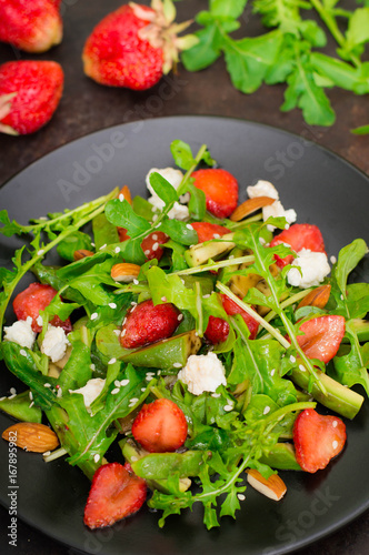 Salad with arugula, strawberries, cottage cheese, olive oil, on a black plate, Old black background. Close-up. Top view