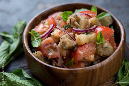 Salad with baked eggplants, fresh tomatoes and mint in a wooden bowl, close-up