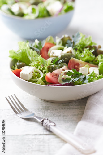 salad, bowl, greek salad, green olives, feta, background, bright, cooking, cookery, delicious, diet, dietary, dieting, dinner, dish, endive, food, fresh, green, healthy, healthy diet, homemade, ingredient, italian, italian food, leaf, lettuce, lunch, meal, mediterranean, natural, nourishment, oil, olive, olive, organic, red, red onion, rustic, snack, tasty, tomatoes, vegetable, vegetarian, white, wood, wooden