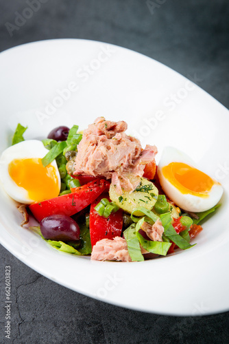 salad with soft-boiled egg, tuna, green onions, boiled potatoes, side view