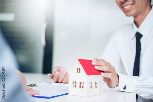 Sale agent giving house to customer and sign agreement contract, Insurance Home concept