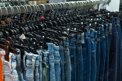 pant, trousers, jean, cotton, lot, sale, shop, selection, store, shopping, boutique, retailer, slack, breech, hanging, choice, casual attire, clothes, denim, female, clothing, shirt, sell, buy, retail, hanger, textile, collection, fashion, choose, wear, fabric, apparel, concept, style, casual attire, designer, fashionable, horizontal, marketing, no people, clothing store, clothes rack, lifestyle, material, selling, buying, blue