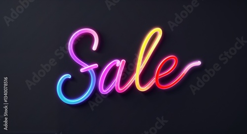 sale glowing colorful neon cursive calligraphy lettering on plain black dark background