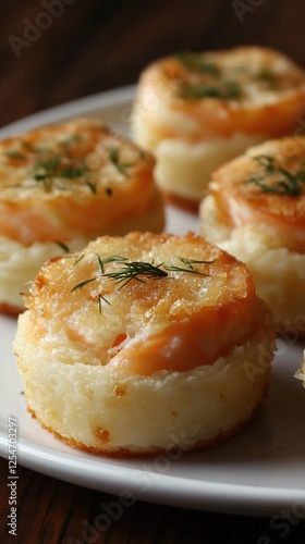 salmon, potato, cake, dill, garnish, plate, white, food, baked, brown, wooden, table, close, up, light, meal, fish, snack, round, small, portion, creamy, cooked, fresh, herb, ingredient, cookery, savoury, delicate, delicious, epicure, gold, crust, soft, texture, surface, top, view, nobody, simple, elegant, presentation, style, culinary, dish, treat, studio, photo