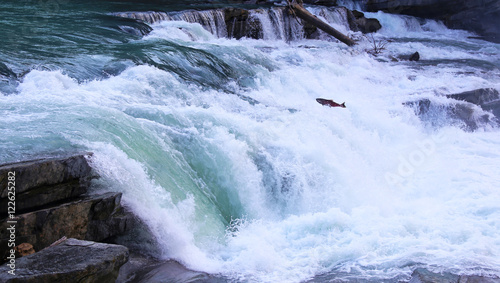 color image, horizontal, photo, nobody, no people, outdoors, daytime, day, animal, animal, fresh water, cascade, cascade, waterfall, waterfall, fauna, vertebrate, vertebrate, wildlife, fish, salmon, flowing, canada, british columbia, natural world, nature, pristine, backcountry, wilderness, jumping, jump, spawning, seasonal