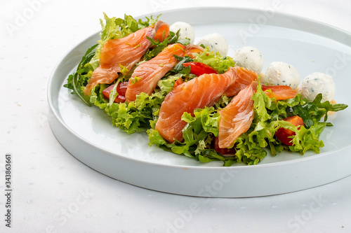 Salmon salad with cheese balls on a white plate
