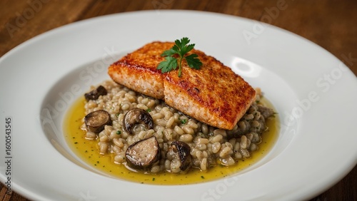 Salmon Steak Accompanied by Risotto and Forest Mushrooms