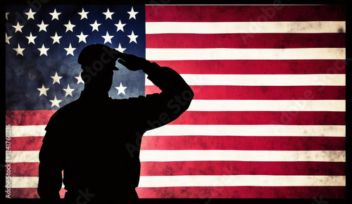 Saluting the Nation - Silhouette of a soldier saluting against a distressed American flag background. Patriotic image ideal for Veterans Day, Memorial Day, or Independence Day.