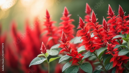 Salvia splendens Vista Red blooming in the garden, Scarlet sage closeup