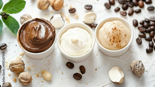 Sample skin care products on white table with shea macadamia nut and coffee butter cream