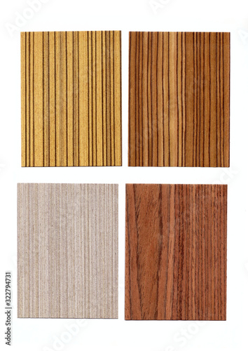 Samples of veneer wood on white background. Material for interior architecture and construction or furniture finishing design concept.