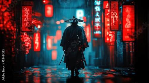 samurai, street, rain, night, japanese, city, urban, dark, red, blue, wet, light, lantern, walk, silhouette, man, figure, traditional, culture, asian, warrior, sword, hat, hood, street light, pavement, neon, gloomy, gloom, mystery, dramatic, lonely, shadow, signs, symbol, art, digital, concept, photo