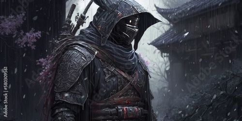 samurai, assassin, villain, cinematic, sword, warrior, hero, fantasy, dark background, emperor, cosplay, ninja, war, fighter, eye, glow, fog, smoke, flames, epic, japan, cyborg, illustration, goddess, black, dark, beauty, head, graphic, comic, science fiction, posing, land, god, robotic, steel, weapon, light, lightning, background, wallpaper, gamer, generative, ai