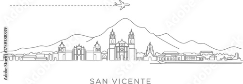 city, city landscape, silhouette, skyline, architecture, mountain, aeroplane, travel, tour tourism, destination, urban, modern, line art, outline, vignetting, vector, graphic, illustration, design, vacation, trip, journey, explore, adventure, aerial view, international, landscape, nature, background, white, grey, minimalist, simple, clean, global, landmark, central america, el salvador, metropolitan, capital city, iconic, building, church
