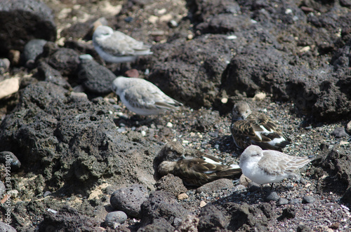 Sanderling Calidris alba and ruddy turnstones Arenaria interpres resting. Arinaga. Aguimes. Gran Canaria. Canary Islands. Spain.