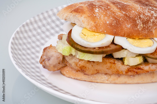 Sándwich de solomillo de cerdo con huevo duro, lechuga y rodajas de tomate.