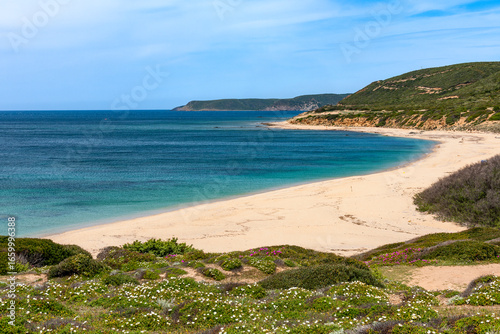 Sandy bay with wildflowers on the west coast of Sardinia Italy
