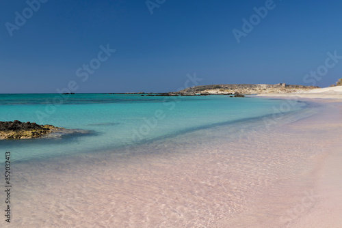 Sandy beach background. Gentle waves crash upon the shore. Pink sand. Pink shells. Elafonisi. Crete. Greece.