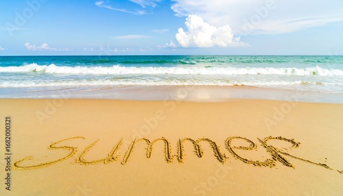 beach, sand, ocean, summer, wave, sky, cloud, blue, water, gold, sunshine, vacation, relax, holiday, tranquil, beautiful, coastal, seacoast, paradise, warm, gentle, horizon, nature, sea, view, relaxing, calm, sandy, written, text, letter