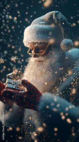 santa, gift, snow, christmas, holiday, cheer, festive, winter, sparkle, joy, magic, glove, beard, red, white, happiness, surprise, family, celebration, culture, tradition, closeup, adult, joyful, atmosphere, warmth, smiling, wrapping, container, decoration, toy, nostalgia, soft, cosy, environment, scene, portrait, snowfall, glimmer, light, cheerful, sentiment, festivity, emotion, wonder, personality, elderly, caring