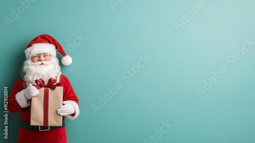 Santa Claus holding a wrapped gift in front of a turquoise background.