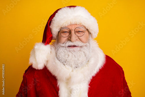 Santa Claus in classic red suit with white fur hat and beard smiles warmly against bright yellow background