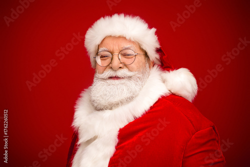 Santa Claus in red suit with white fur hat and beard smiles at camera in a festive Christmas stock photo conveying joy family tradition and holiday magic