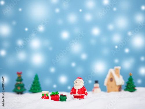 Santa claus in the town with shiny light for Christmas and New Year holidays background, Winter season, falling snow, Copy space for Christmas and New Year holidays greeting card.