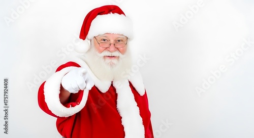 santa, claus, christmas, holiday, winter, season, man, male, person, people, figure, character, costume, red, suit, hat, white, beard, goggles, spectacle, pointing, finger, hand, gesture, expression, face, smile, happy, joyful, cheerful, festive, traditional, iconic, legend, mythical, figurehead, symbol, greeting, invitation, attention, sharpened, studio, background, isolated, clean, simple, portrait, head shot, closeup
