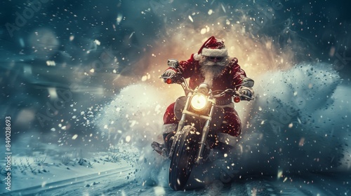 Santa claus riding motorcycle in snowstorm