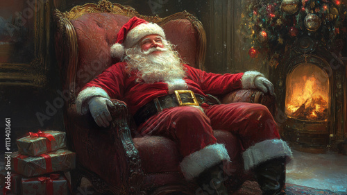 Santa Claus sitting on an antique armchair in a cozy, dimly lit room with candles and festive decorations, evoking a classic Christmas atmosphere.