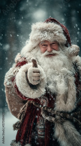 Santa Claus smiles and gives a thumbs up in a snowy forest during the holiday season