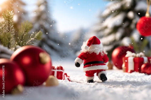 santa, walking, winter, landscape, trail, gift, snow, decoration, red, christmas, tree, ornament, figure, scene, festive, holiday, joy, character, nature, scenery, spirit, celebration, gift box, cold, magical, atmosphere, cheerful, environment, snowfall, wandering, traditional, colours, playful, small, toy