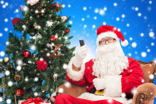 smiling, santa, claus, christmas, smartphone, tree, present, gift, armchair, holiday, saint, saint nicholas, red, man, senior, people, person, happy, mature, christmas, christmas, december, winter, celebration, male, beard, season, merry, goggles, decorated, contraption, app, application, technology, mobile phone, mobile, phone, social, networking, connection, cyberspace, wi-fi, online, communication, browsing, background, snow, snowflake, snowing, blue
