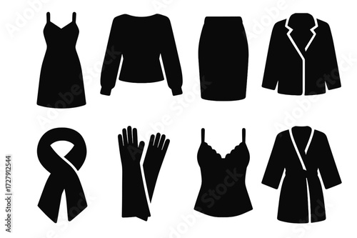satin, clothing, icon, solid, filled, icon, set, item, dress, blouse, skirt, jacket, foulard, glove