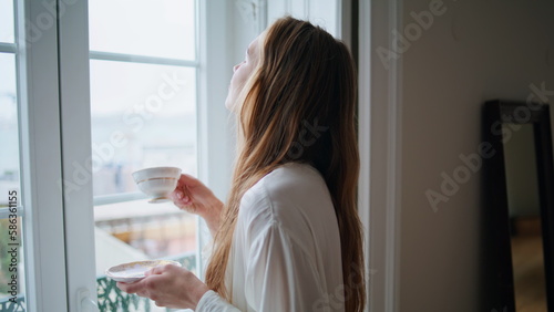 Satisfied lady enjoying cup of coffee at home closeup. Woman watching window
