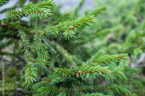 Saturated green pine tree fir needles. Evergreen forest macro close up texture blurred background