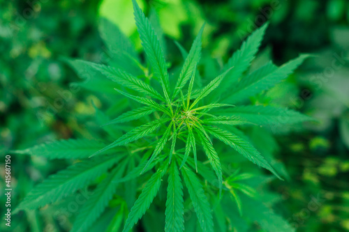 Saturated leaves on marijuana bushes. Top view