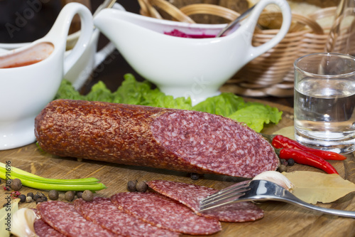 sausage on a wooden plate in a restaurant