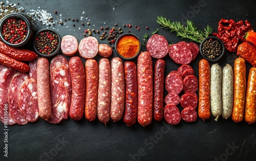 sausage, meat, spice, dark background, topview, charcuterie, butcher shop, seasoning, food preparation, food photography, culinary arts
