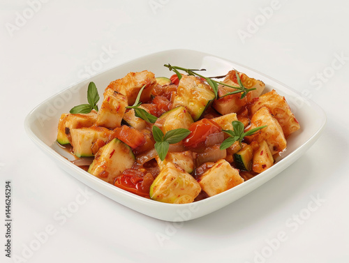 food, dish, sauteed, cube, vegetable, tofu, meat, cooked, plate, white, square, bowl, sauce, healthy, meal, food preparation, isolated, closeup, red, orange, brown, white background, eatery, cookery, lunch, dinner, portion, nourishment, diet, receipe, ingredient, light, food photography, ready to eat, copy space