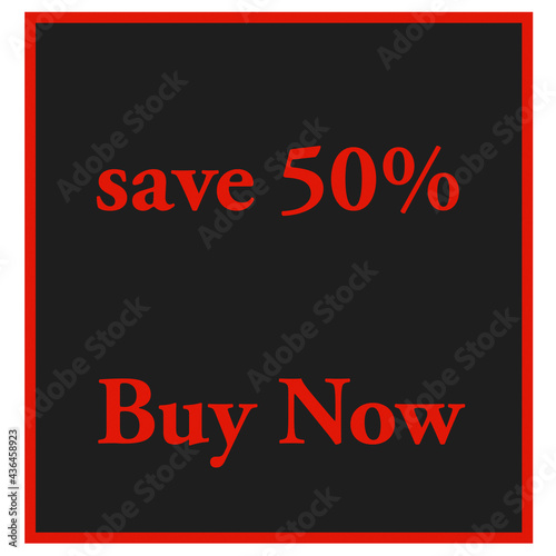 Save 50% buy now text in red colour