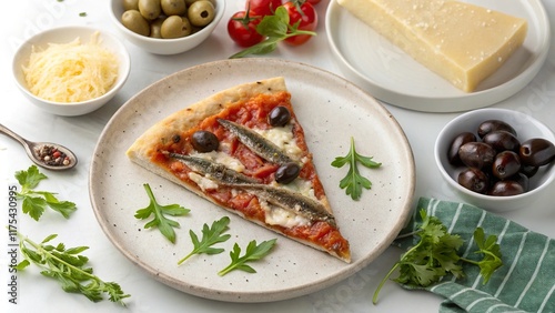 Savory anchovy pizza slice garnished with fresh ingredients on a light table setting