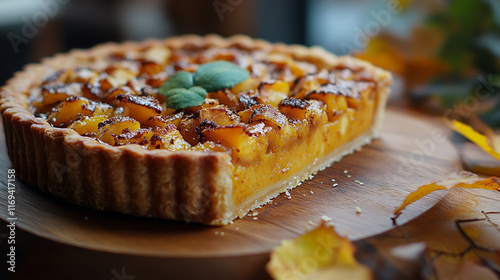 dessert, pastry, baked goods, wooden board, autumn, leaf, seasonal, food, sweet, homemade, nature, cosy, rustic, kitchen, treat, slice, coffee time, warm, freshness, receipe, ingredient, fruit, delicious, epicure, artisan, presentation, celebration, comfort food, craft, indulgent