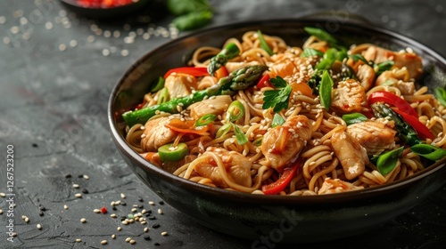 Savory Asian noodles with chicken, asparagus, colorful peppers, sesame seeds, and soy sauce on dark concrete background