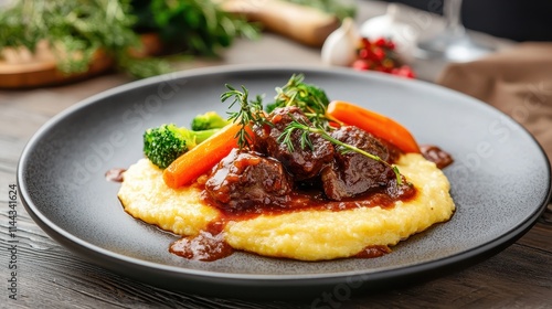Savory Beef Stew on Creamy Polenta with Colorful Vegetables and Fresh Herbs