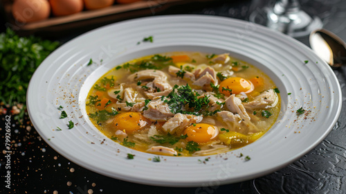 georgian, cookery, chicken, soup, quail, egg, traditional, food, fresh, herb, rustic, hearty, homemade, white, bowl, dish, delicious, alimentary, meal, comfort, egg, yolk, authentic, dinner, lunch, broth, poultry, garnish, culture, culinary, photo, dark, background, tasty
