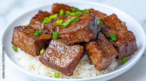 beef, rice, dinner, food, cookery, meal, receipe, dish, cooking, delicious, tasty, appetising, epicure, culinary, gastronomy, eatery, menu, plate, food photography, hi-res, image, photo, picture, illustration, meat, protein, savoury, glazed, cube, green onion, garnish, fluffy, white, bed, culinary arts