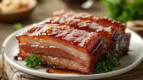Savory Glazed Pork Belly on White Plate Garnished with Fresh Parsley, Perfect for Delicious Culinary Presentations and Gastronomic Dishes