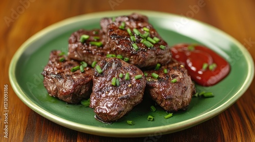 Savory grilled beef fillet garnished with chives served on green plate with ketchup on wooden table background